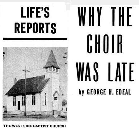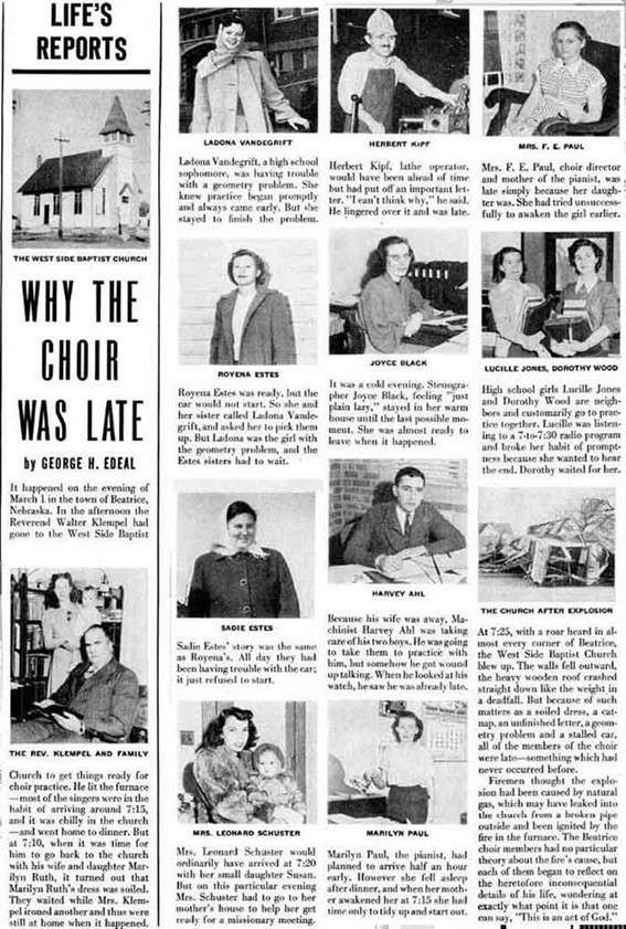 A Igreja Batista West Side, de Beatriz, Nevasca, em 1950 tinha um coro que se reunia para os ensaios todas as quartas-feiras às 19:00. A diretora do coro, Martha Paul, era extremamente exigente sobre pontualidade e procurava dar o exemplo, sempre chegando cedo junto com sua filha, Marilyn Paul Mitchell, que era a pianista.